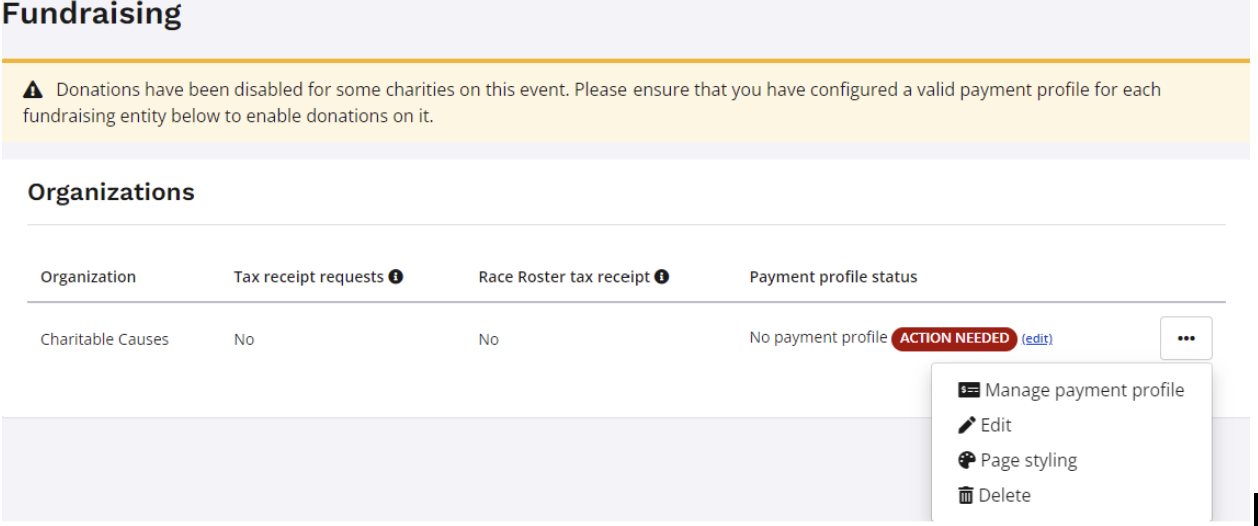 Here you will find the fundraising organisations you have been granted access to. Now it’s time to set up a payment profile for this charity. - Click the 3 dots on the right and choose manage payment profile