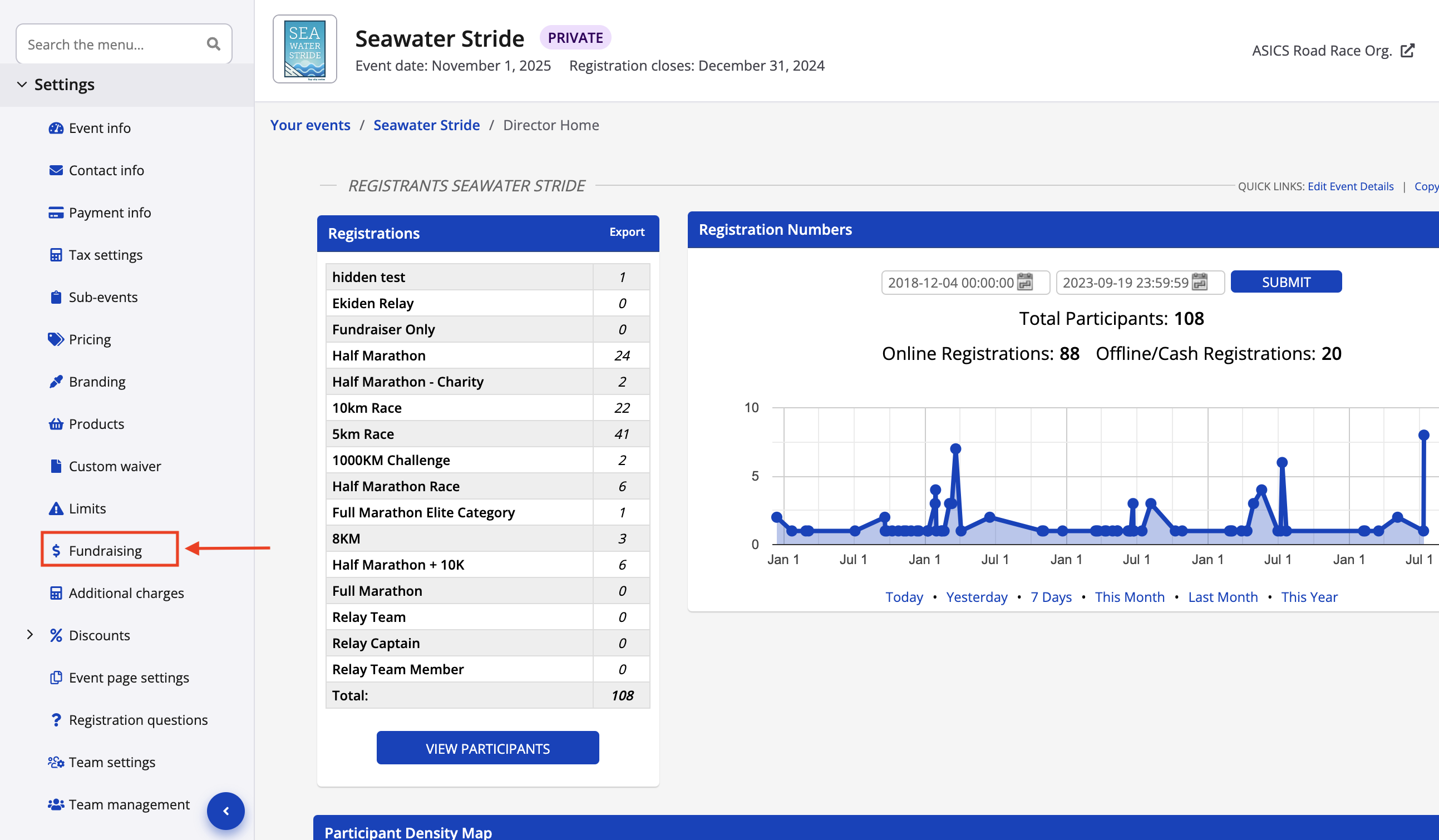 1. From your event dashboard, click on settings -> fundraising to find your fundraising/Grassrootz settings.