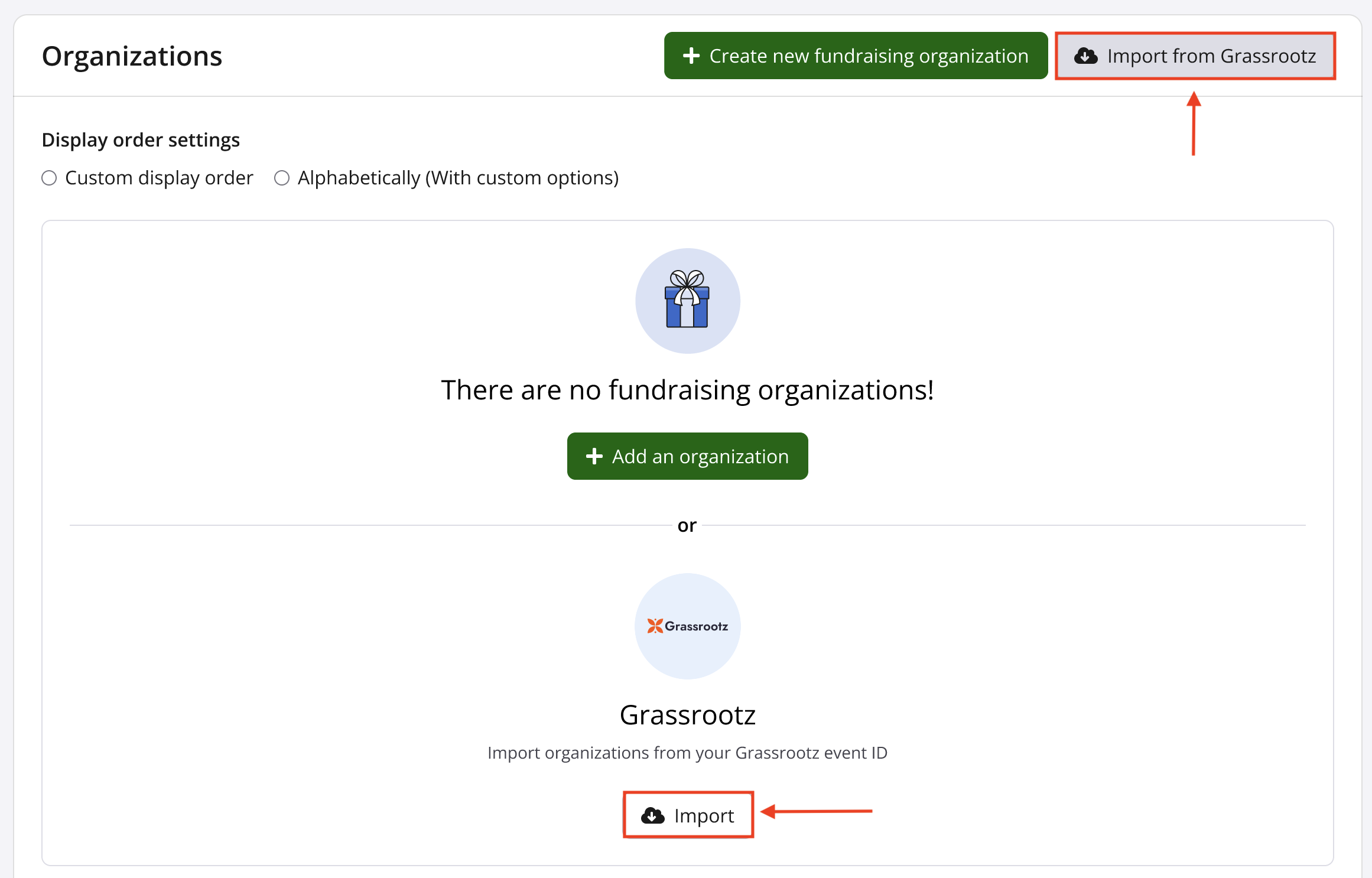 4. Import your existing charities from Grassrootz into Race Roster by clicking the Import from Grassrootz or Import button found within the Organizations section.