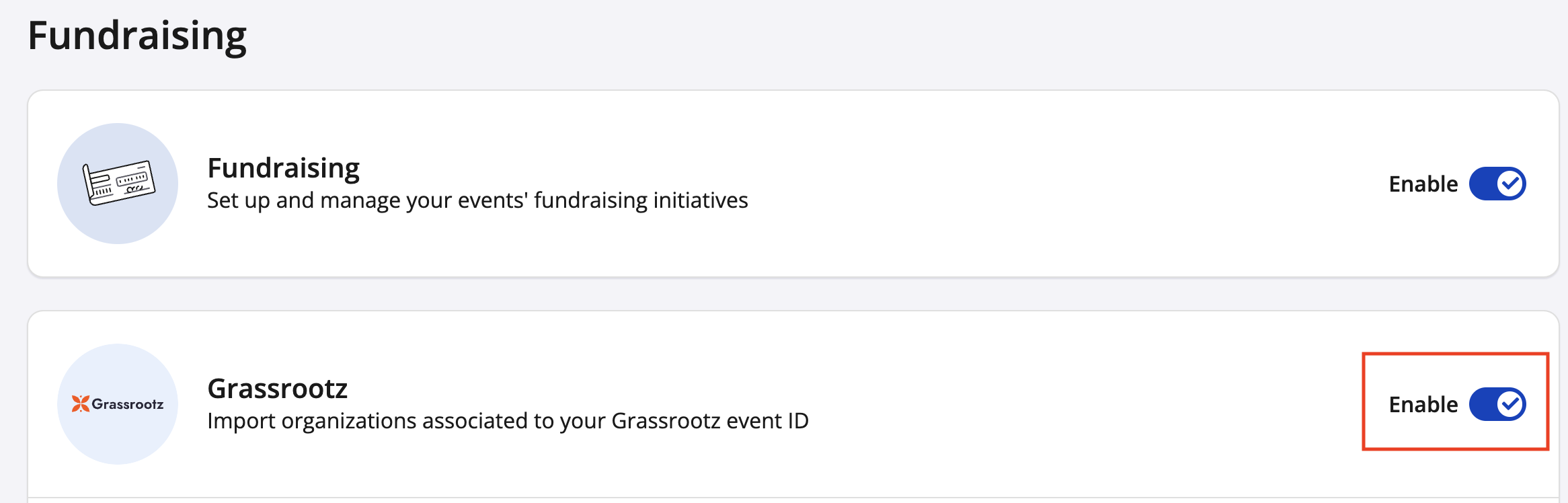 2. From your fundraising settings, enable Grassrootz on your event by enabling the Grassrootz setting toggle.
