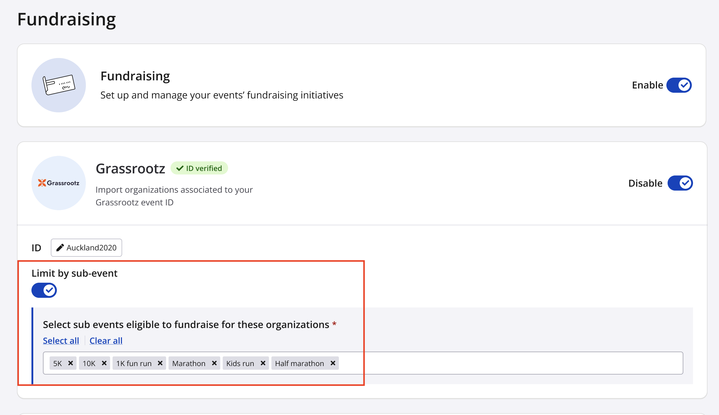 6. If necessary, limit specific sub-events to be able to fundraise for your Grassrootz charities by enabling the setting "Limit by sub-event" selecting the charities that you wish to enable fundraising on.