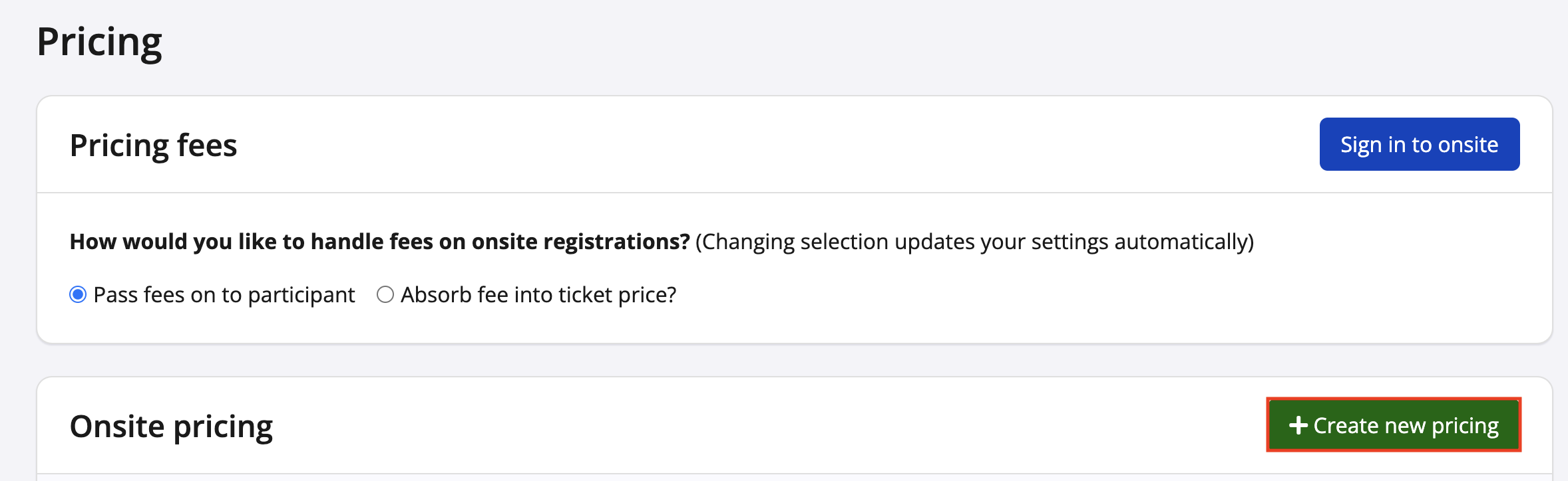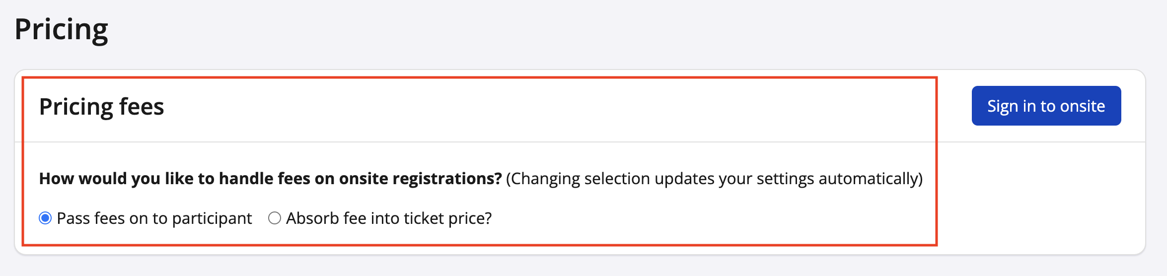 2. Select if you would like to pass fees on to participants or absorb fees into the event's ticket price. Depending on your choice, when a participant arrives at the checkout step during onsite registration, they will either: