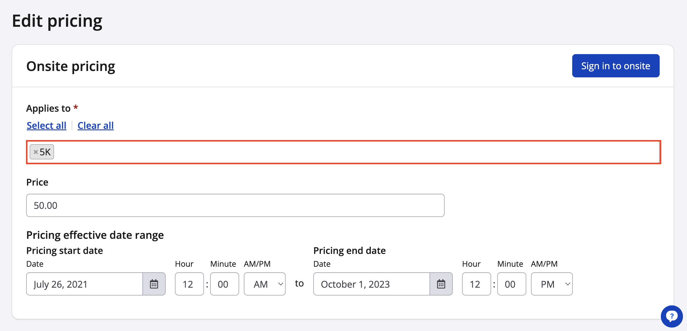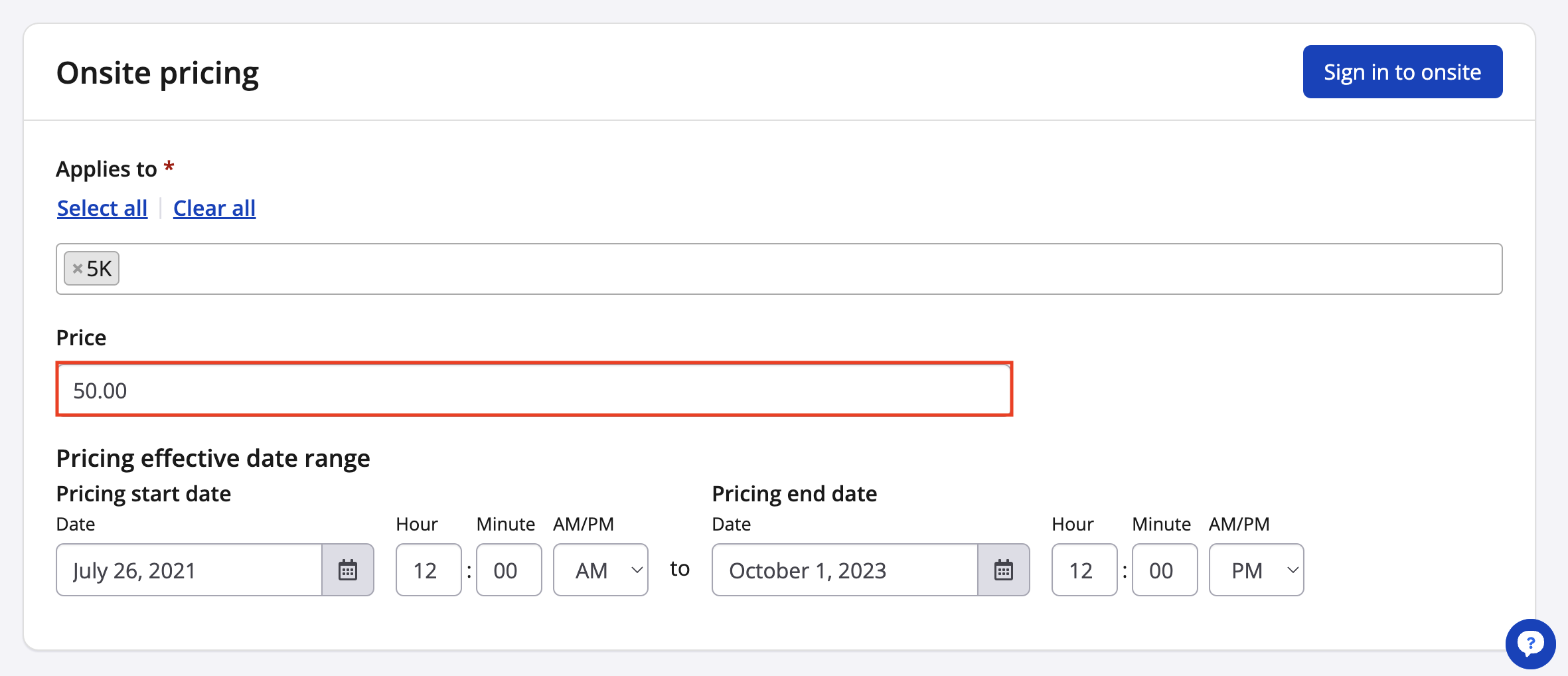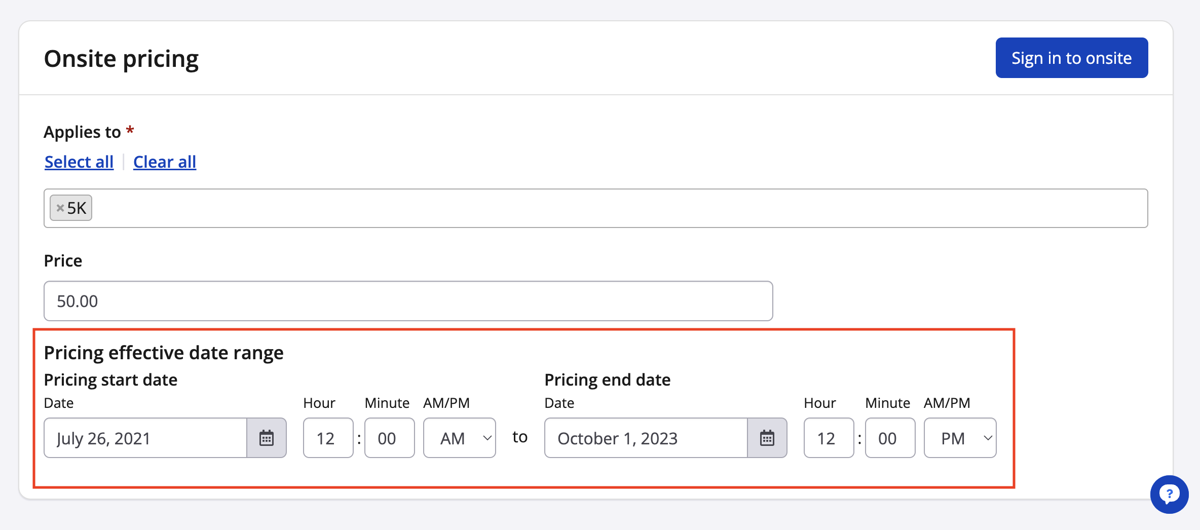 6. Select the pricing start and end date (in other words, the onsite registration availability period) for the selected sub-event(s). Upon the price end date, the sub-event(s) will no longer appear on the onsite registration form.