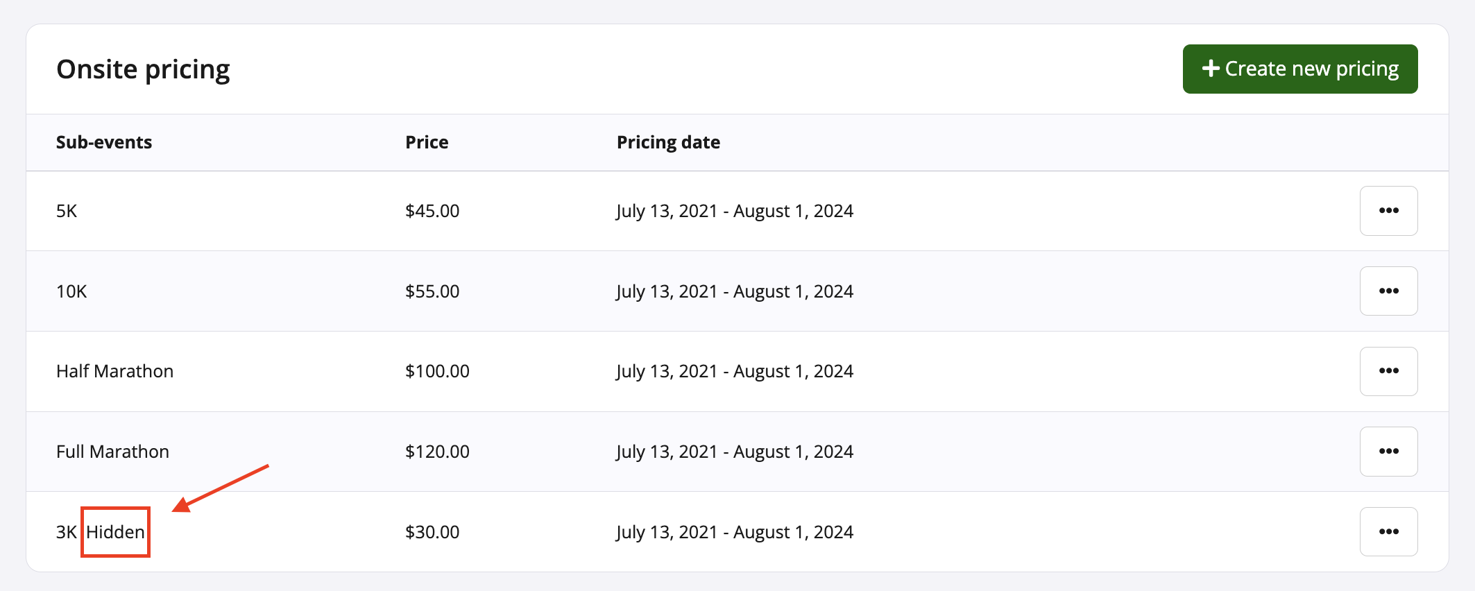NOTE: If a sub-event's visibility is disabled in the sub-event settings, you can still assign onsite pricing to it. However, the label "Hidden" will appear next to it on the event dashboard's onsite pricing list and a participant won't be able to register for that sub-event during the kiosk registration process.