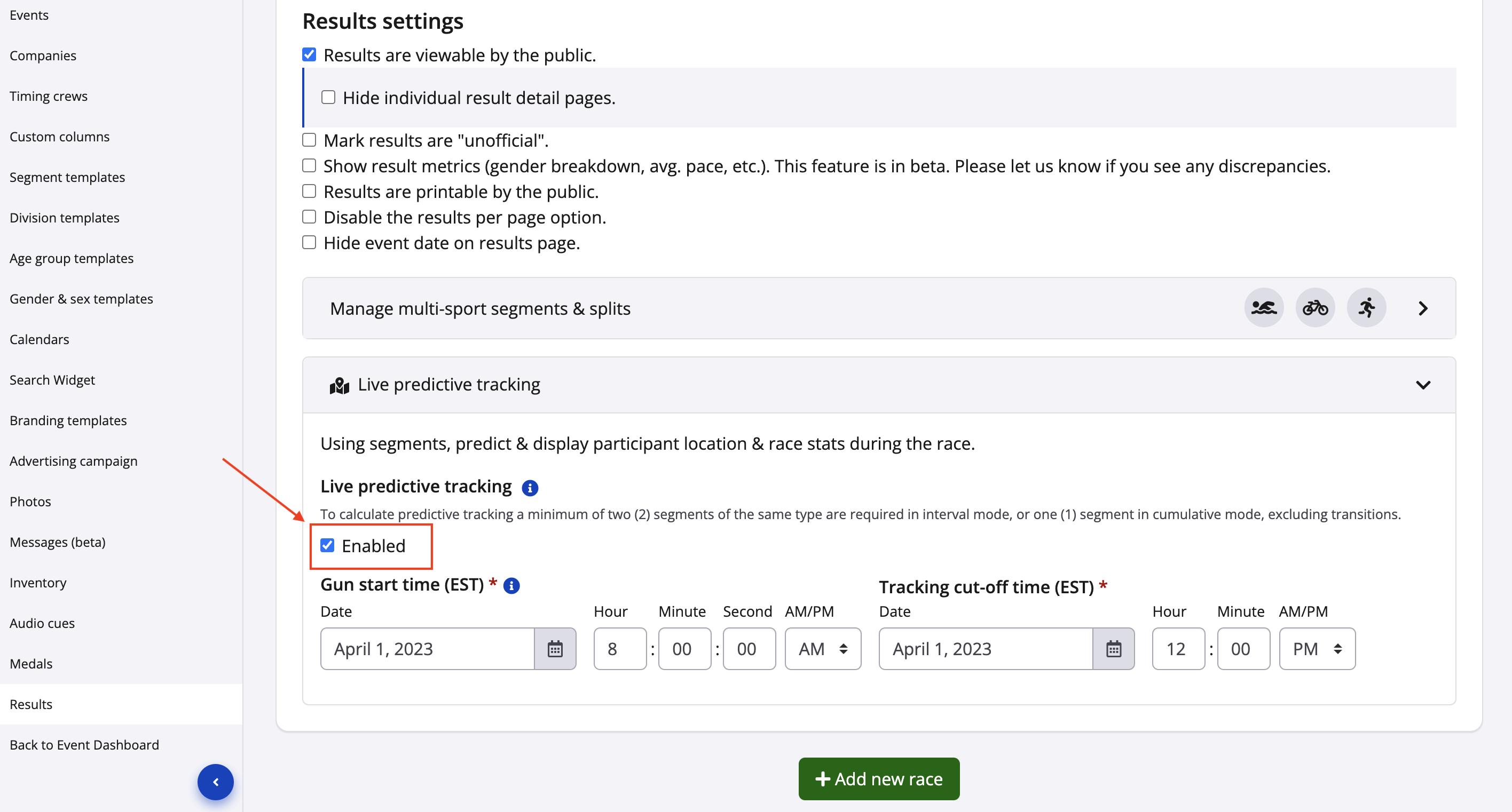 2. From your results dashboard, click Add new race -> Create race to begin setting up the race leaderboard that will be using live predictive tracking.