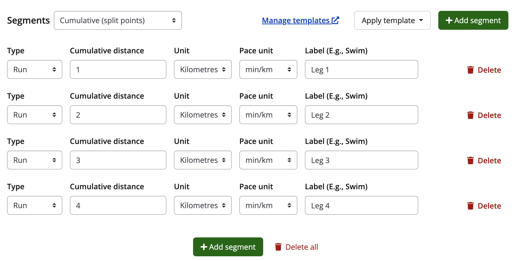 5. Next, configure the segments for the race depending on how you would like the live predictive tracking to display. The two options of segment types to create for your results set are: