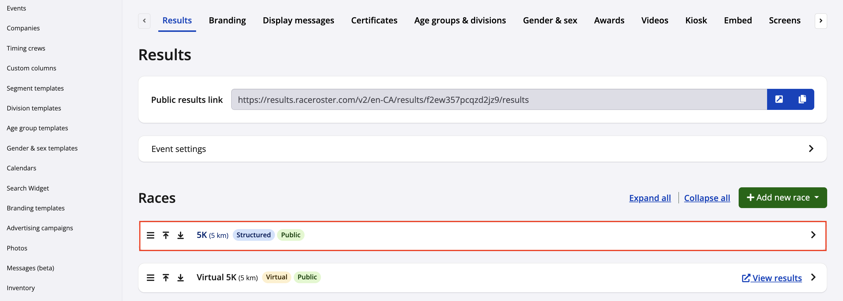 4. From your results dashboard, scroll down to find the race that you will be setting up predictive tracking on and click to expand the race settings.