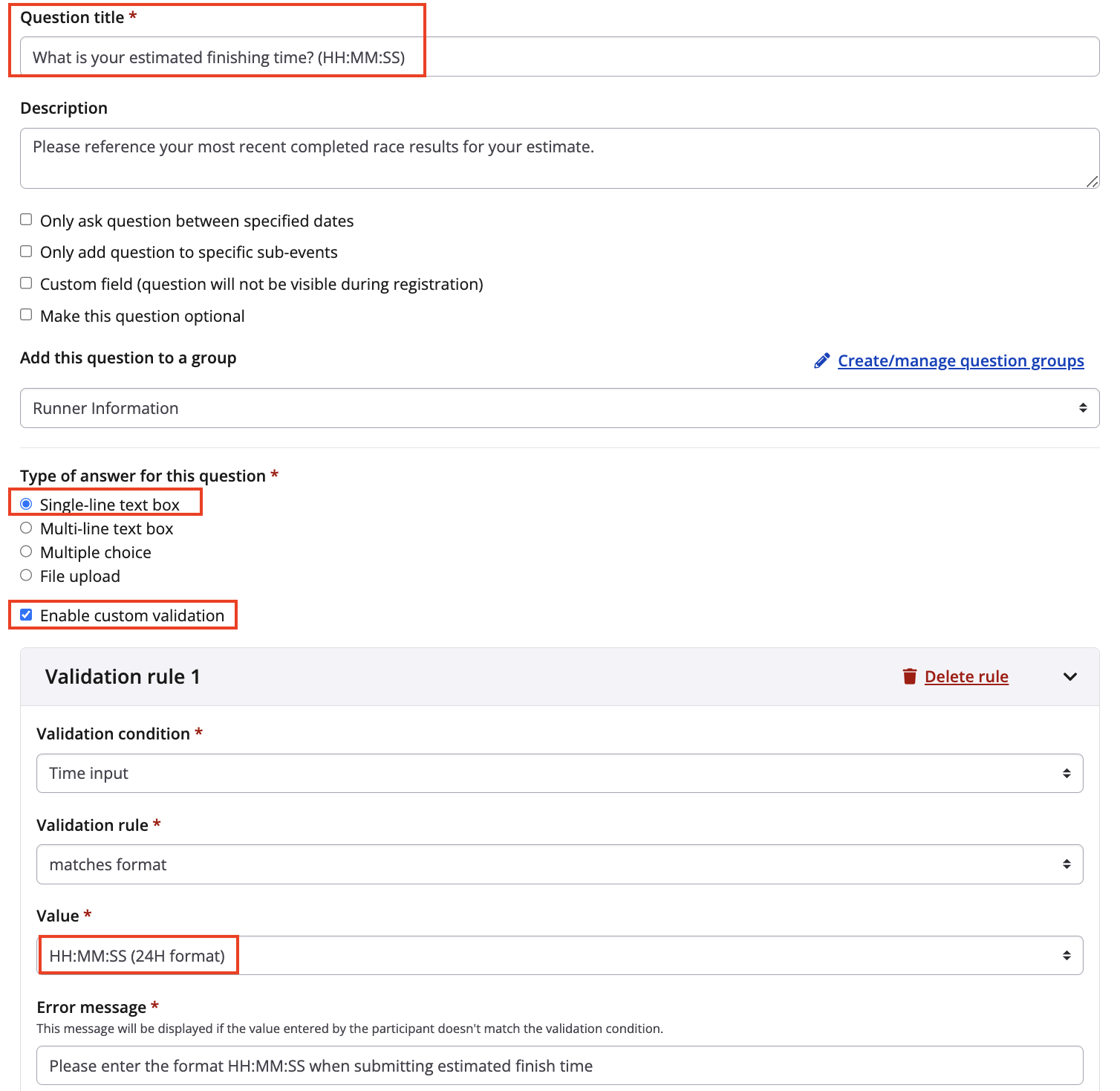 When creating your questions, ensure that the question is set up as a single line text box, with custom validation enabled and specified for the time format you wish to collect (Ex: HH:MM:SS). The participant's response to the question will be used as the data point providing the estimated finish time to plot the runner's progression on the course map on race day.