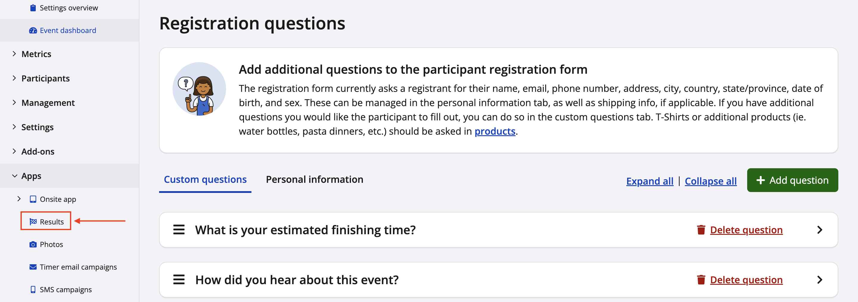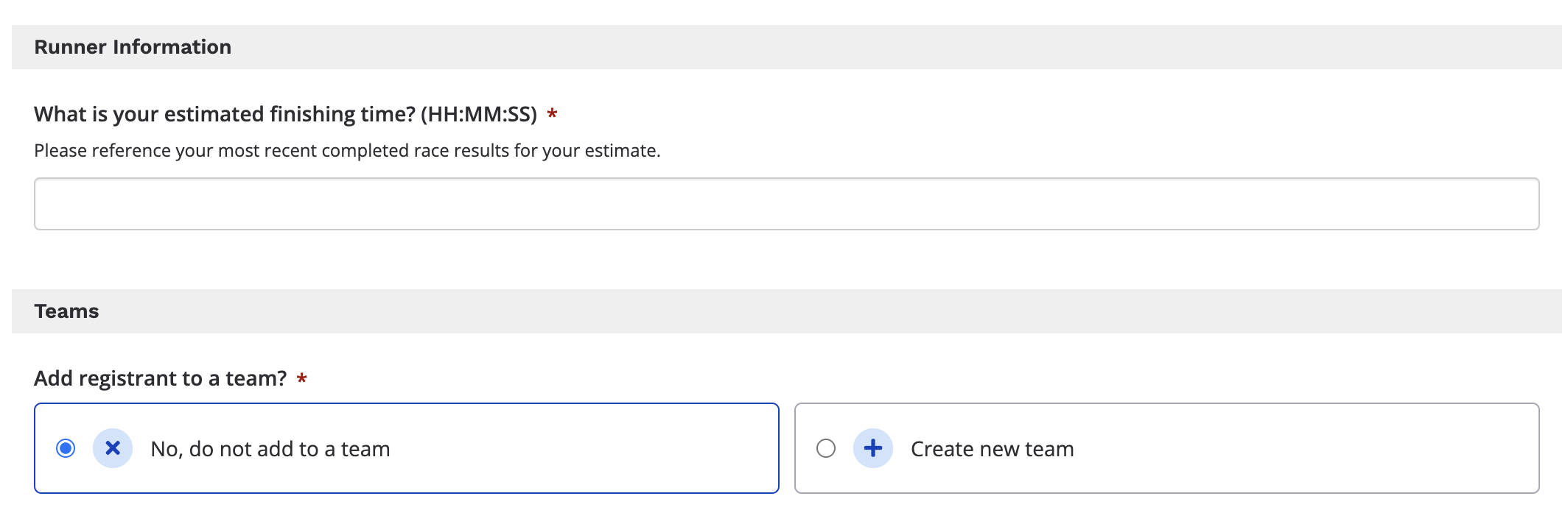 2. From your registration questions settings, create a new question titled "What is your estimated finishing time?". This question will be asked to your participants during registration. View our guide on how to create a custom registration question for more info on this.