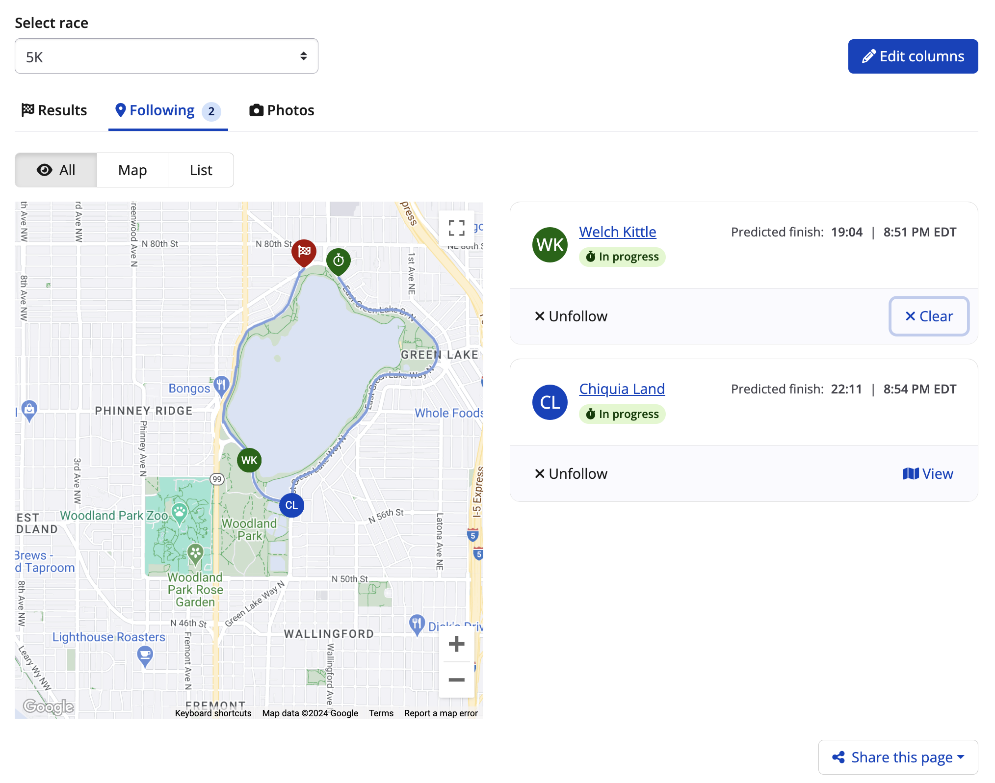 8. After uploading your results, head to your results page and select your desired runners from the results set from the following tab. Any runners selected to follow will appear on the tracking page, allowing you to view the predicted placement of each runner on the race route.