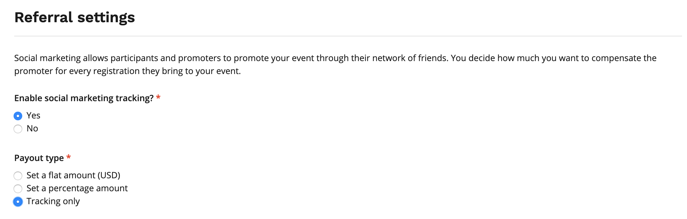 Alternatively, our “Tracking only” option allows you to create your own incentives for promoters, such as promo codes for other events you organize, exclusive event merchandise, etc. For tracking only, there is no social referral commission associated. When selected, you can track how many successful referrals registered through a specific promoter link.