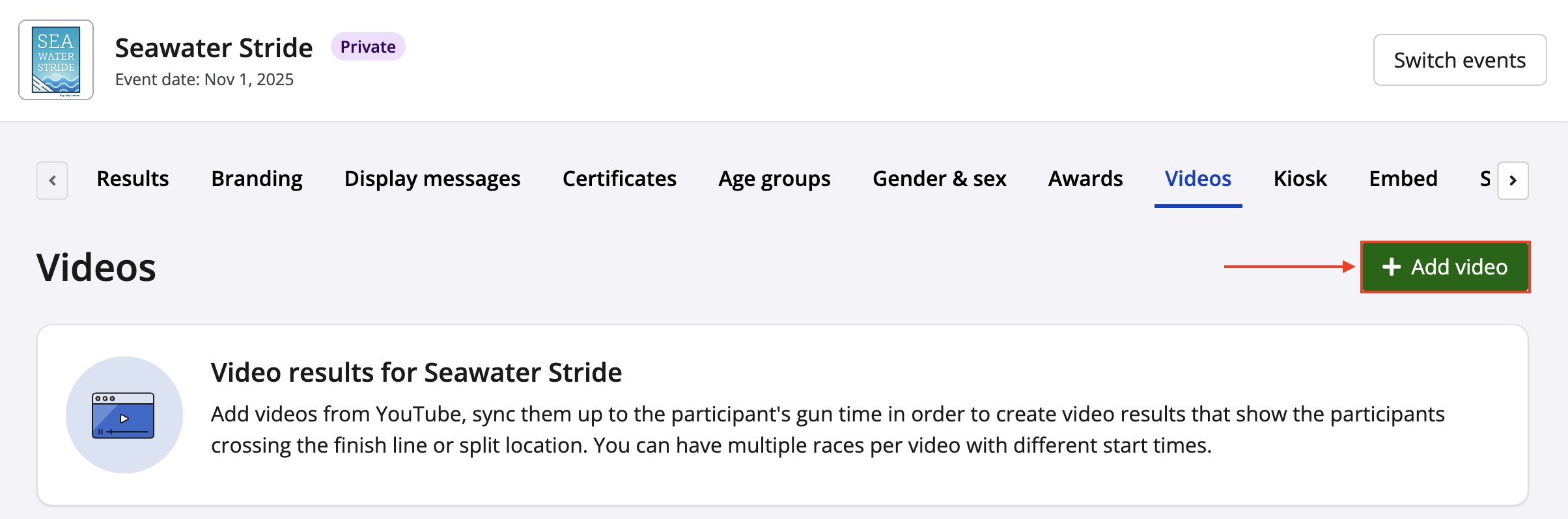 7. Click Add race and apply the video to a sub-event result (i.e. 5k, 10k, Half Marathon, Marathon, etc.)