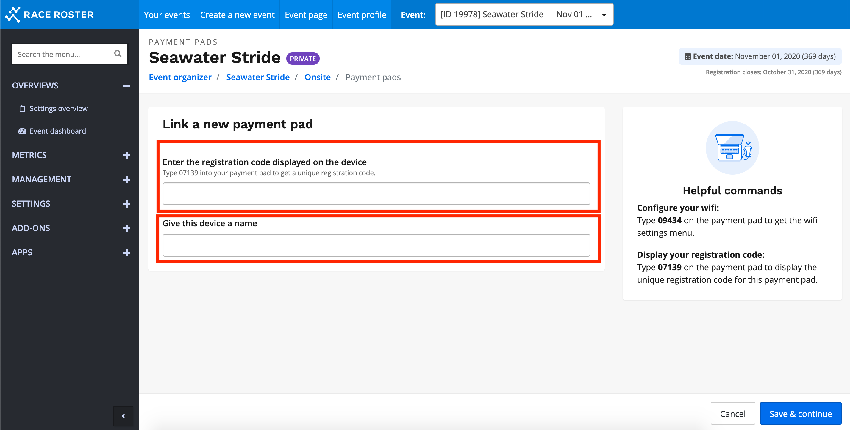 9. To link a payment pad, you will need a unique registration code by pressing 07139 on the pay pad. Enter this unique code in the first text field of Link a new payment pad.