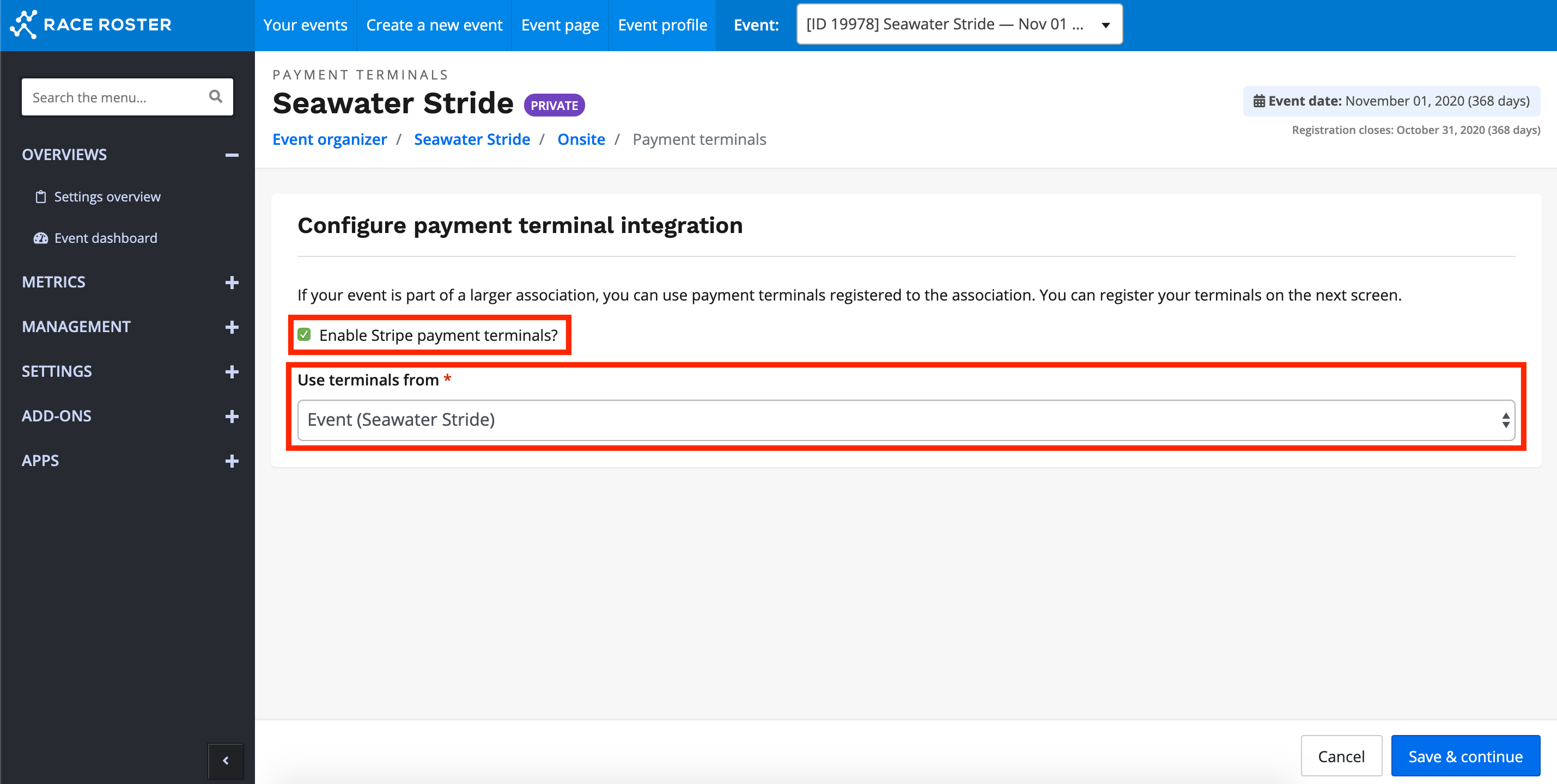 6. You will then be directed to the Payment Terminals page. There you will check off enable Stripe payment terminals and select the event under Use terminals from.