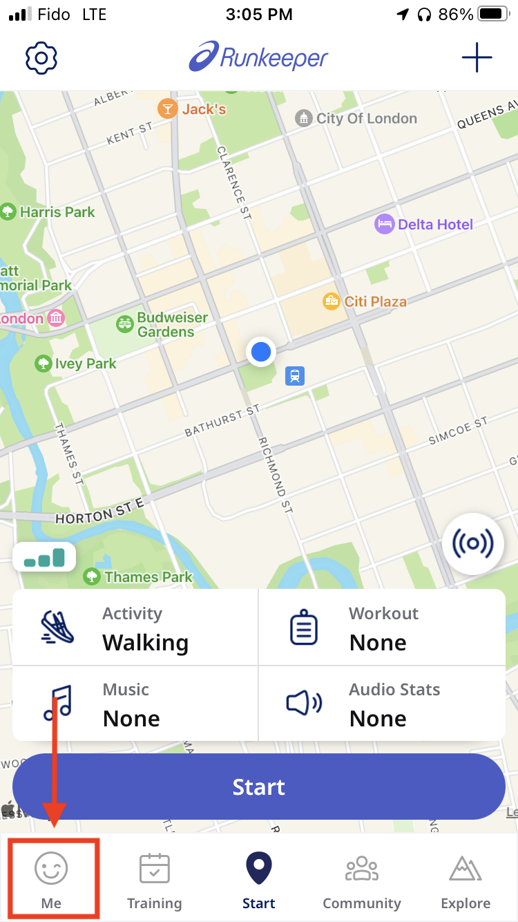 - Open your Runkeeper app on your phone and find the me tab in the bottom lefthand corner of your screen