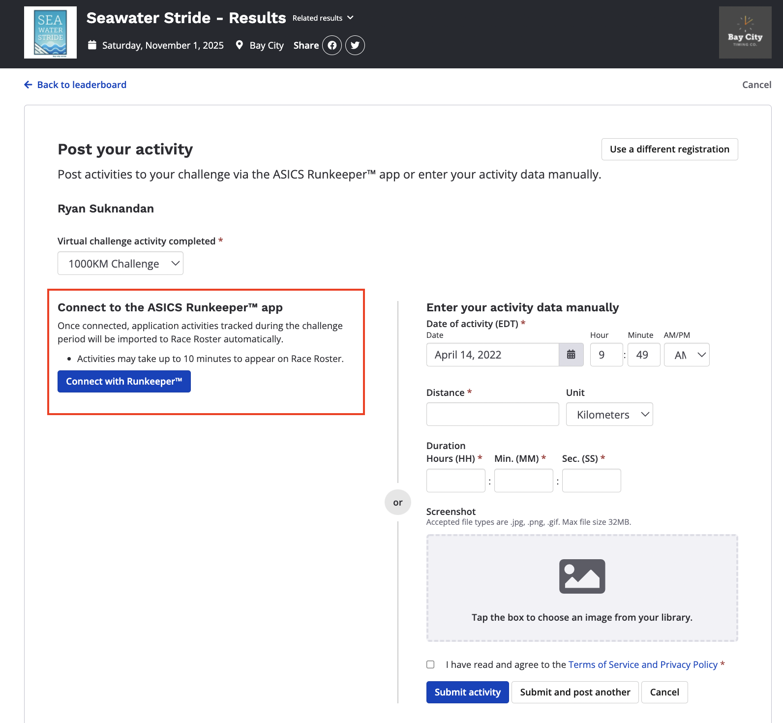 5. After confirming your registration in the system, you will be able to start submitting your activities. From the righthand side of your page, you can manually submit activities by adding in your activity information. On the lefthand side of the page, you can connect with Runkeeper to begin pulling in your already completed activities.