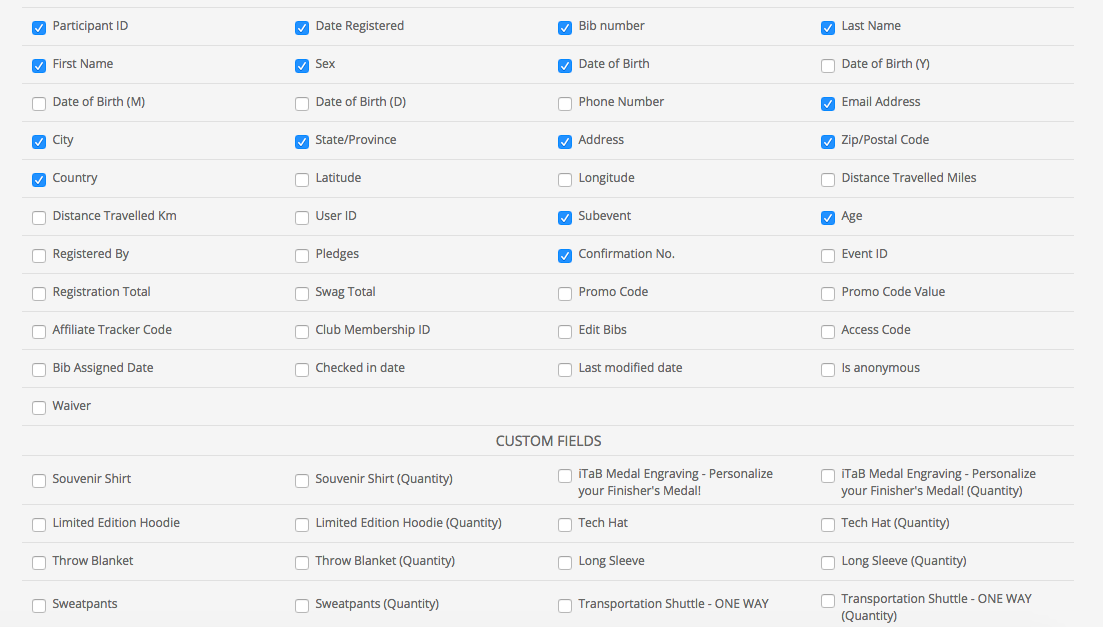 5. Next, check the field boxes that you need in your report (First Name, Last Name, Email, Shirt, etc.)