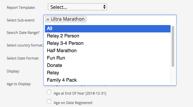 4. The system will open up a report menu, review the options and make your selections (refine sub-events or multiple sub-events, search a date range, display active, inactive or both, decide on age to display)