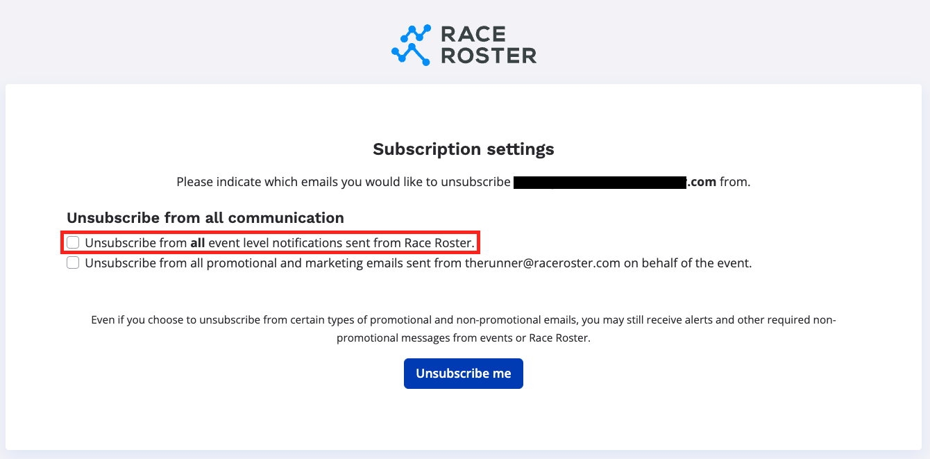 To stop receiving courtesy emails from Race Roster, for all events, click the "Unsubscribe" link at the bottom of the email you receive. Now, from the subscription settings page, select "Unsubscribe from all event level notifications sent from Race Roster." Finally, click the blue "Unsubscribe me" button. See screenshot below.