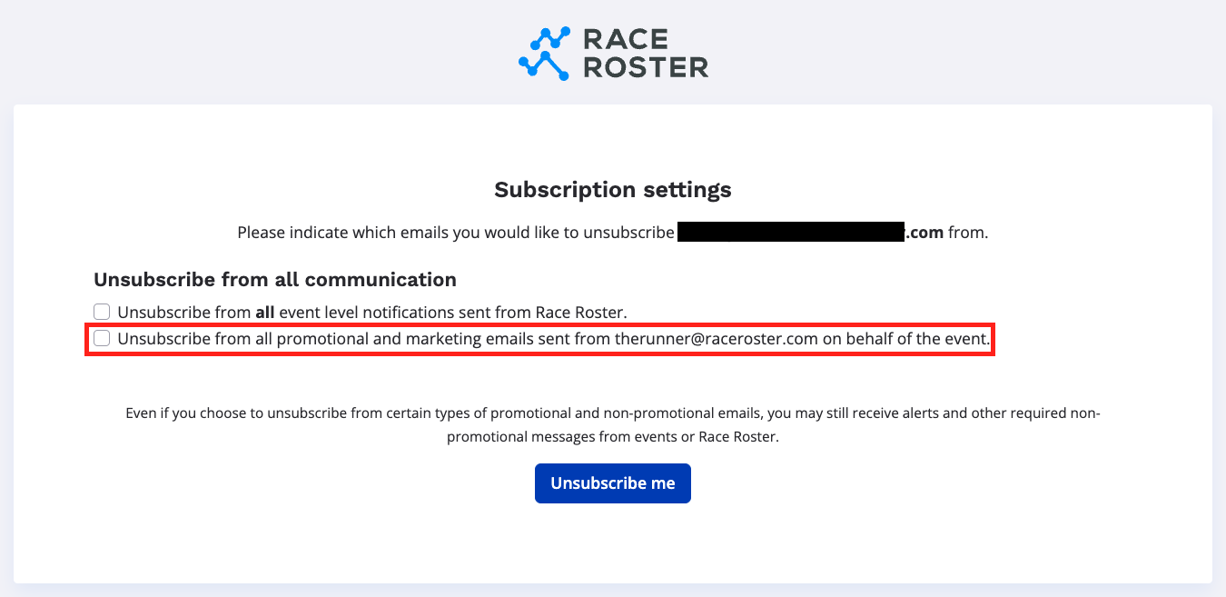 To stop receiving promotional emails from events, on a per-event basis, click the "Unsubscribe" link at the bottom of the email. Then, from the subscription settings page, select "Unsubscribe from all promotional and marketing emails sent from therunner@raceroster.com on behalf of the event." Finally, click the blue "Unsubscribe me" button. See screenshot below.