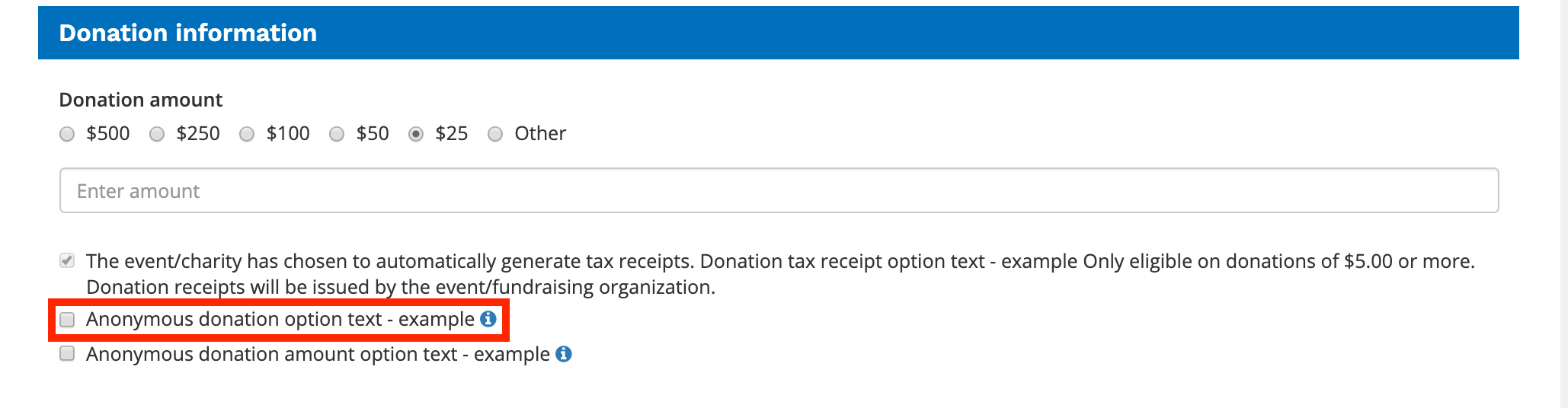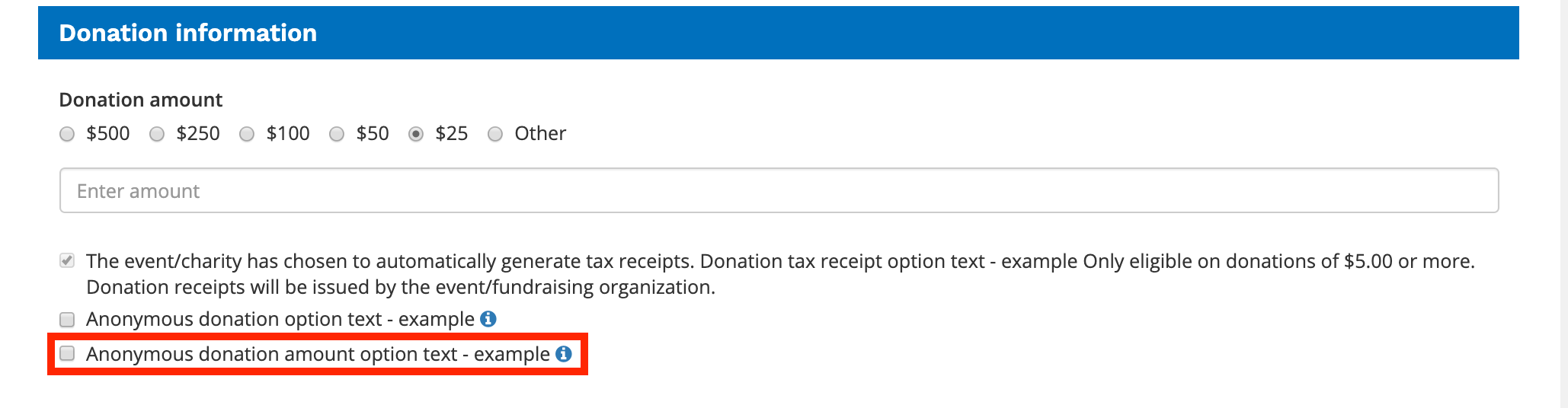 Anonymous donation amount option text: