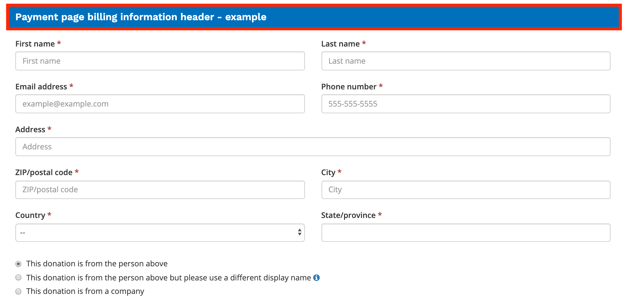 Payment page billing information header: