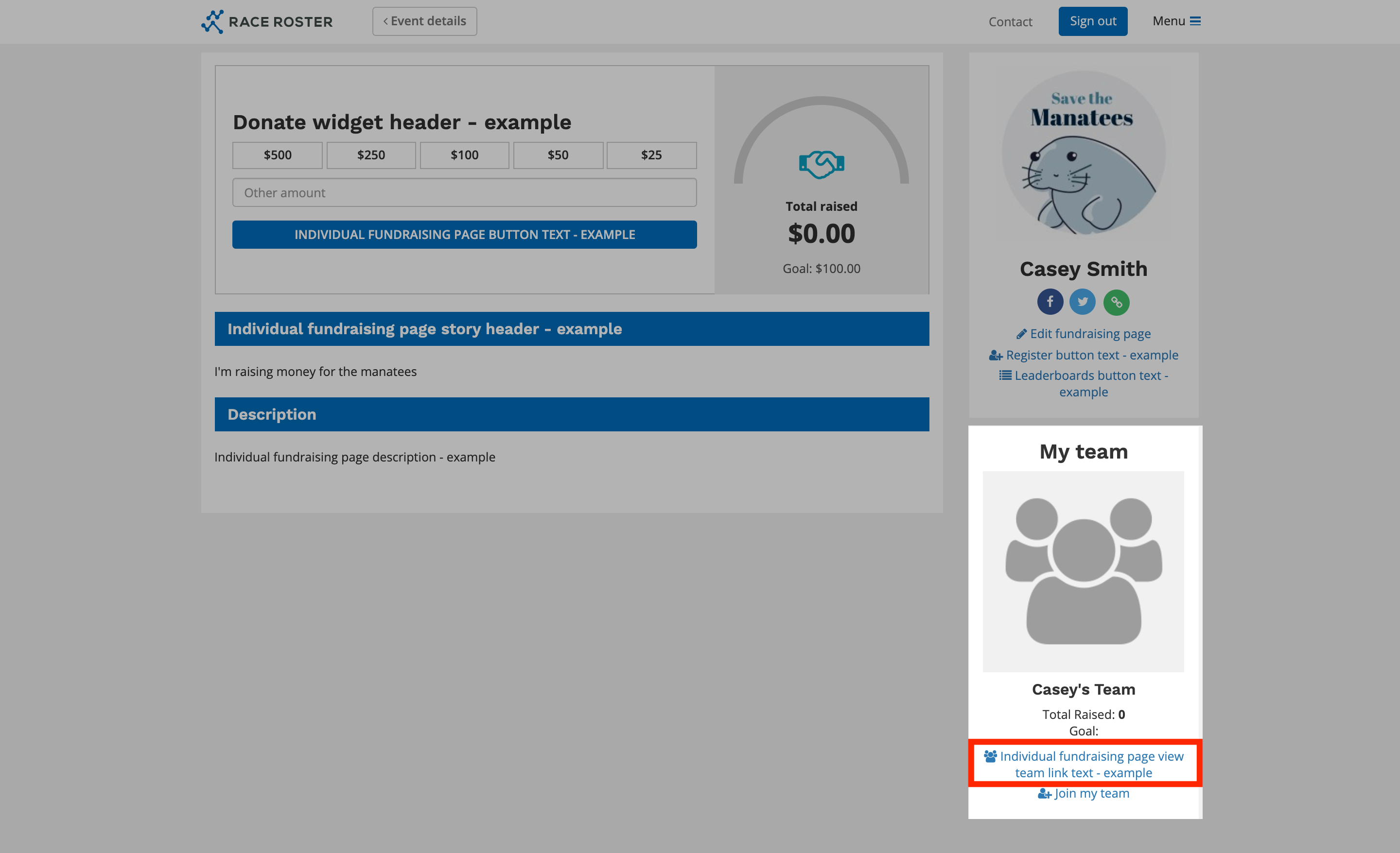 Individual fundraising page view team link text: