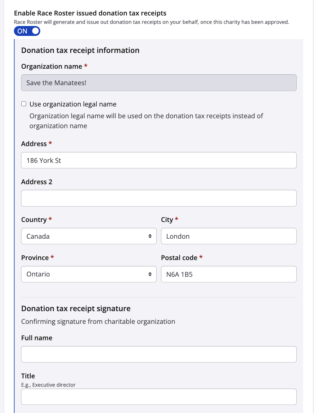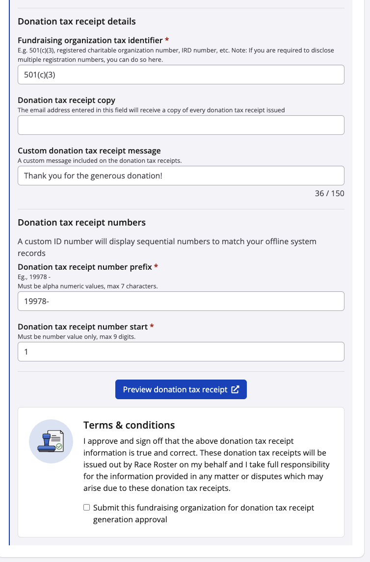 Our Race Roster team will receive the request, reach out to the charity to verify that all the information is correct, and approve the charity receipting. Once approved, the next individual that donates and requests a charity receipt will receive one automatically via email using the information entered in the above form. Receipts will not be retroactively issued until we receive this approval.