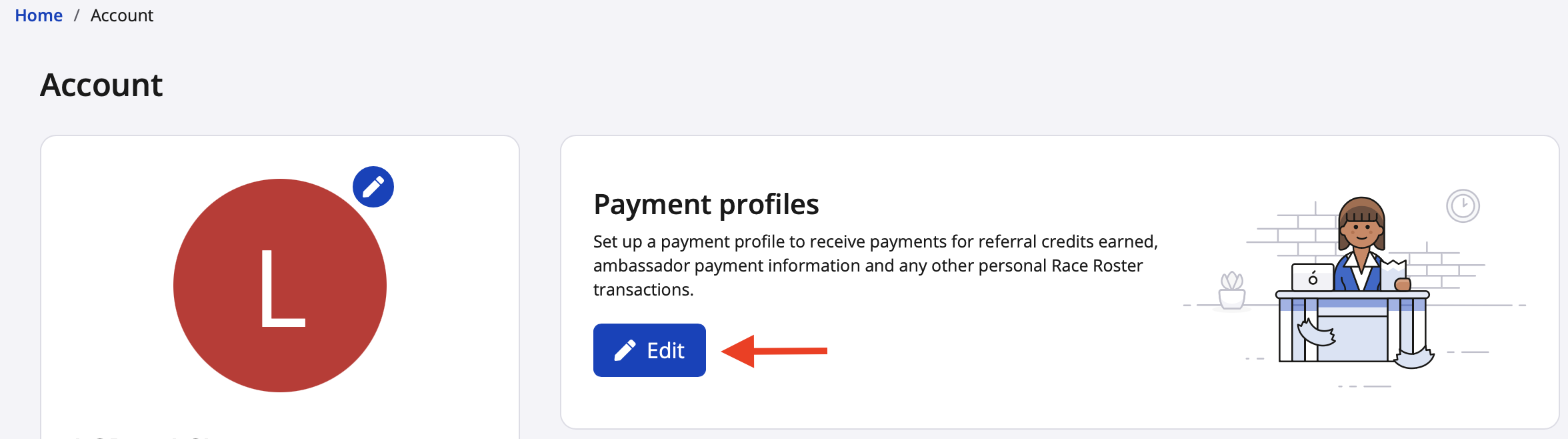 1. Navigate to your account settings and click the blue "Edit" button in the payment profiles section. Screenshot follows.