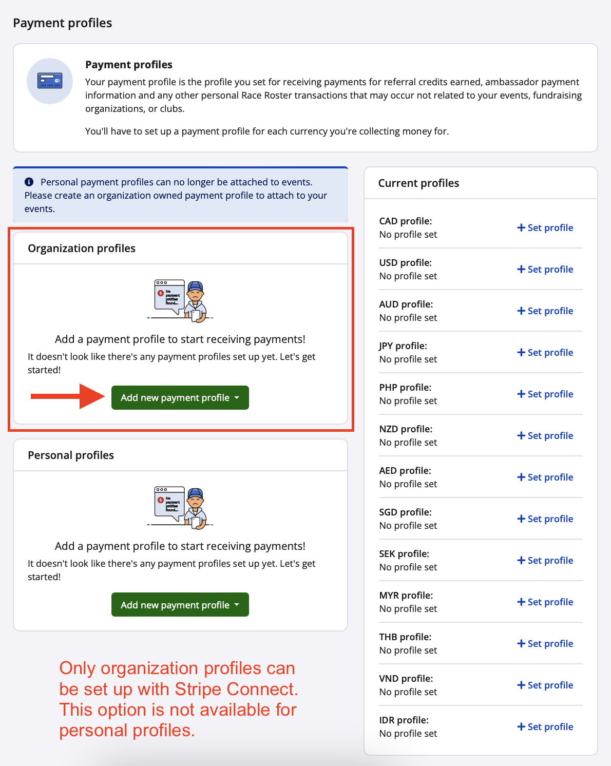 - The way of the future: Effective early 2026, all Race Roster organization payment profiles in USD, CAD, AUD and NZD will require Stripe Connect.