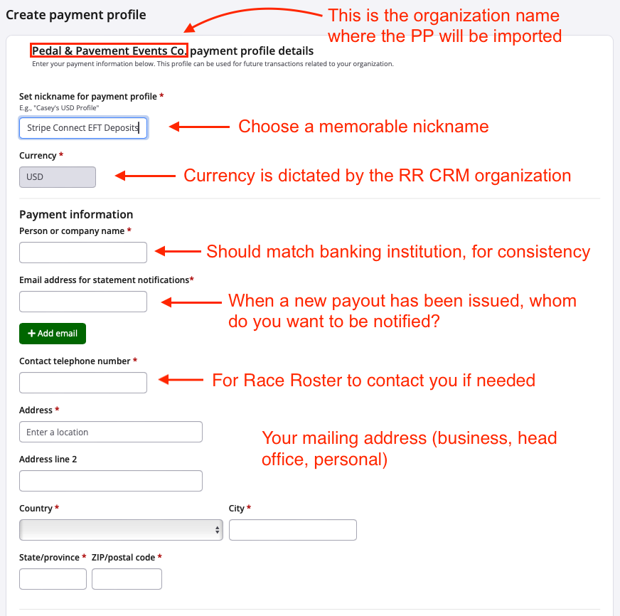 - Email address for statement notifications: Indicate the email address(es) that should receive any new payout statement notifications, across events and fundraising organizations. In other words, for any and all events (EIDs) and fundraising organizations (CIDs) that associate with this payment profile, whom do you want to be notified of a new payout being issued?
