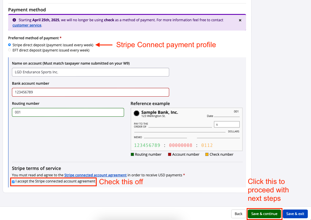 - Preferred method of payment: Select "Stripe direct deposit (payment issued every week)".