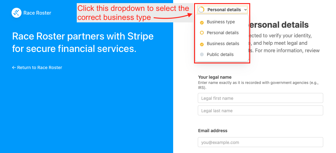 4. On the Stripe Connect profile page, you will see various fields prompting for entry. Before proceeding, use the dropdown menu at the top to select "Business type". Screenshot follows.