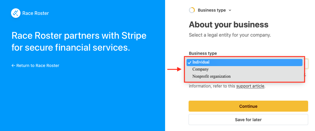 Bear in mind that you may instead click the white "Save for later" button to continue your progress after you have collected the information. You may save the URL to the Stripe Connect page, or re-enter it from your Race Roster account's payment profiles page (Step 1 above).