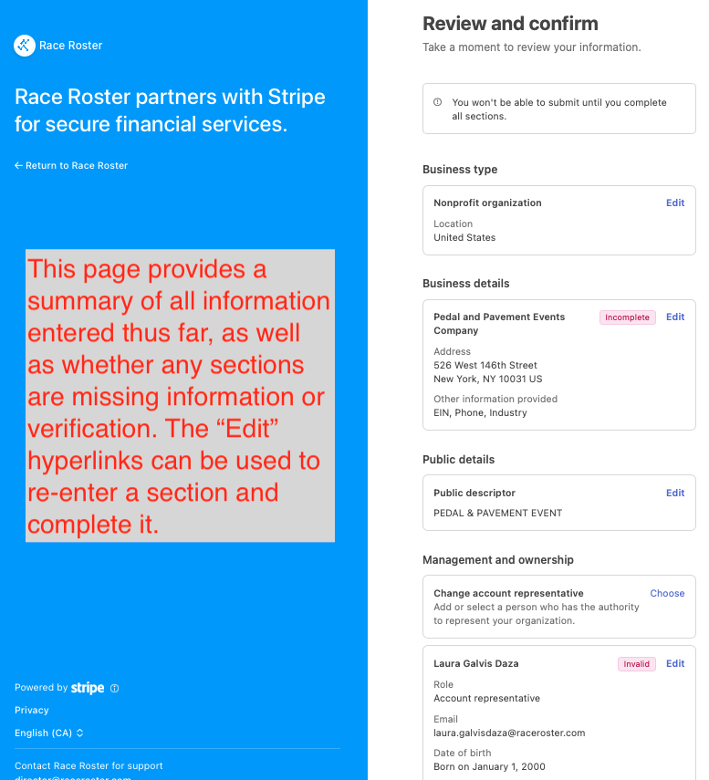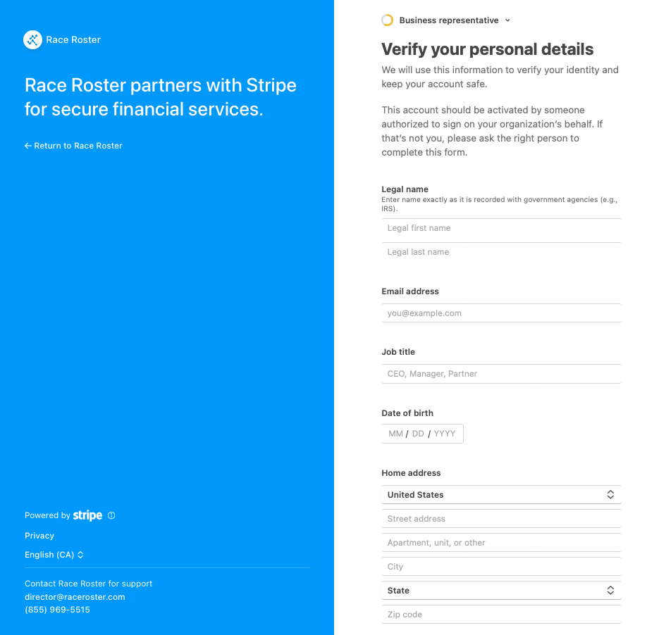 It will take Race Roster and Stripe 1 to 5 business days to review the information and documents that you have provided.