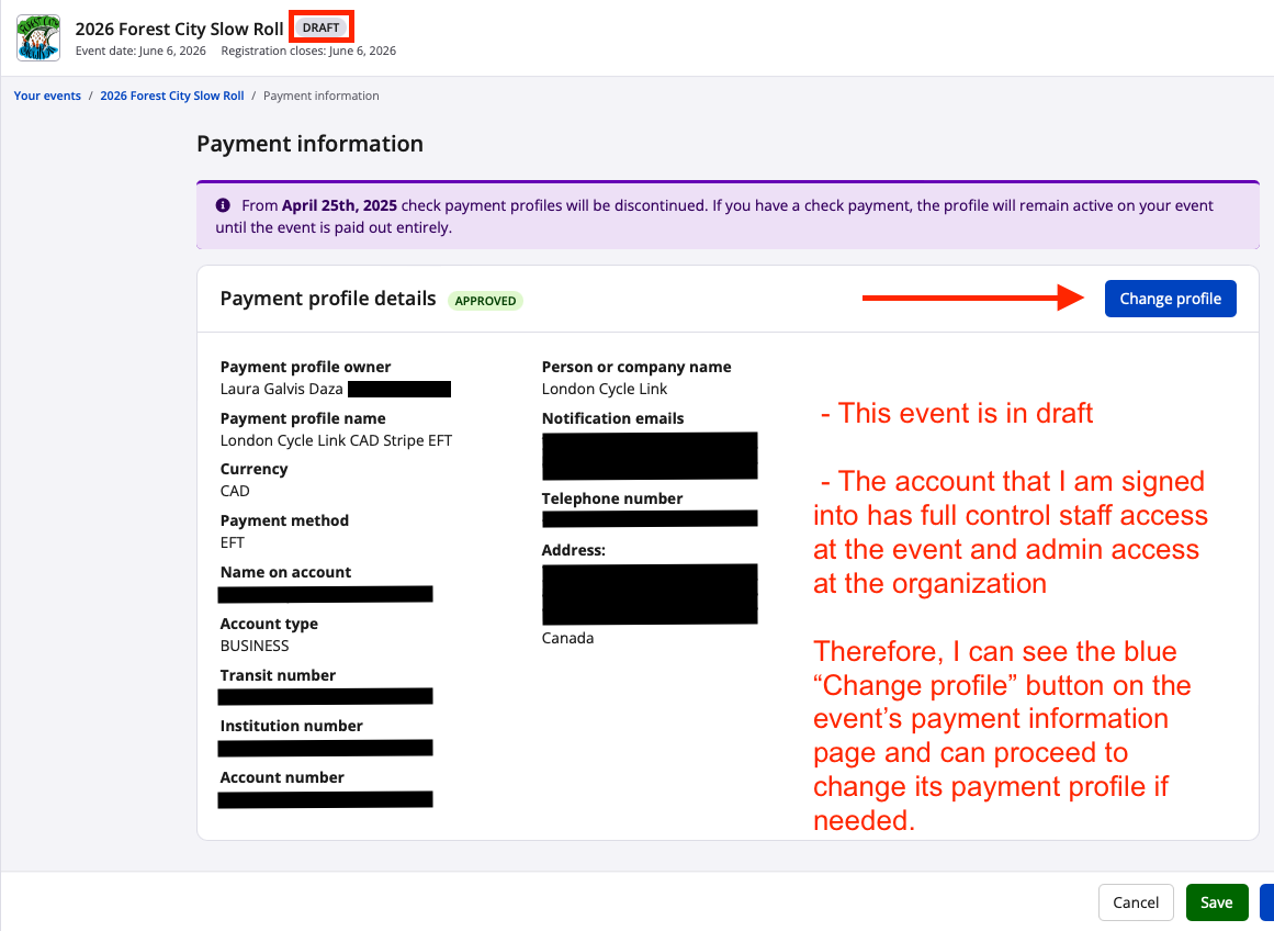 - If an event is in status "Draft" or "Demo", you may change the associated payment profile on the payment information page at any time as long as you have the correct type of access.