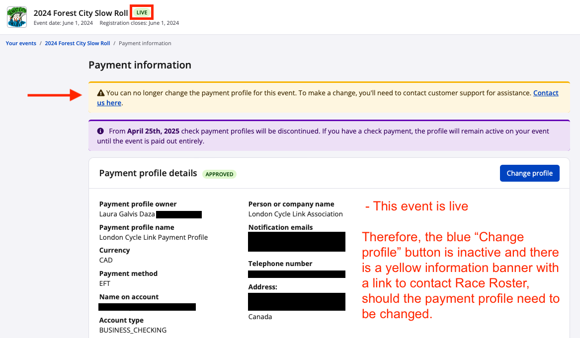 - If an event is in status "Live" or "Private", you must click the hyperlink in the yellow banner at the top of the payment information page. It will prompt you to fill out our contact form, and we'll be in touch to assist you.