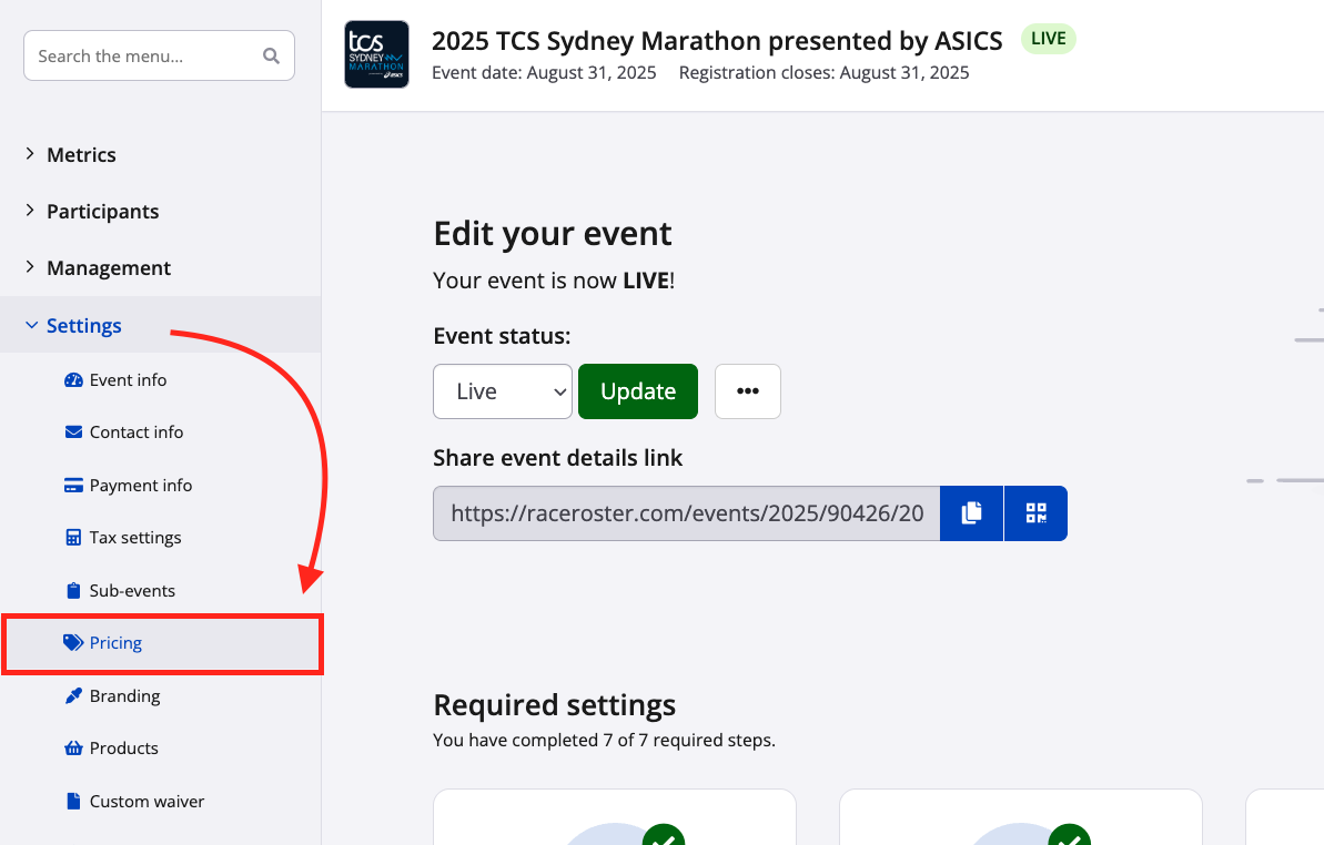 1. From your event dashboard, click on Settings > Pricing from the lefthand menu.