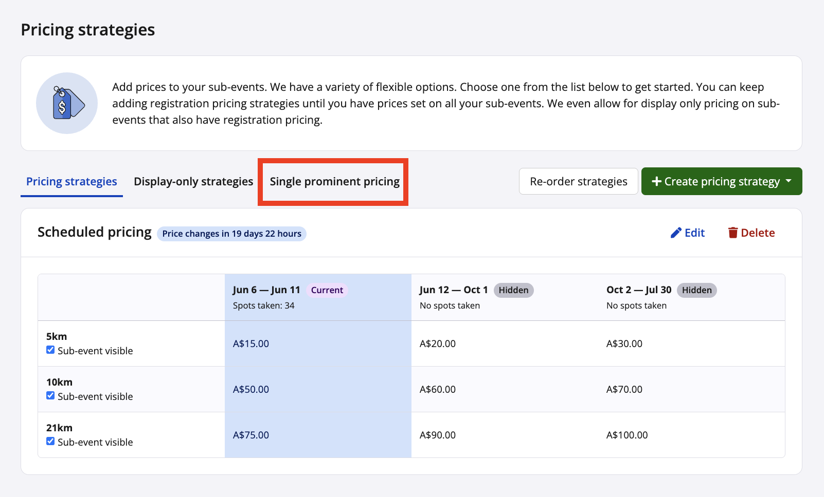 For events in applicable regions, the single prominent pricing tab can be found within the Settings > Pricing page of your event dashboard. This tab will allow you to enable and/or be advised about SPPs displayed on the event's public-facing pages. This tab will list all configured sub-event prices and their corresponding single prominent prices.