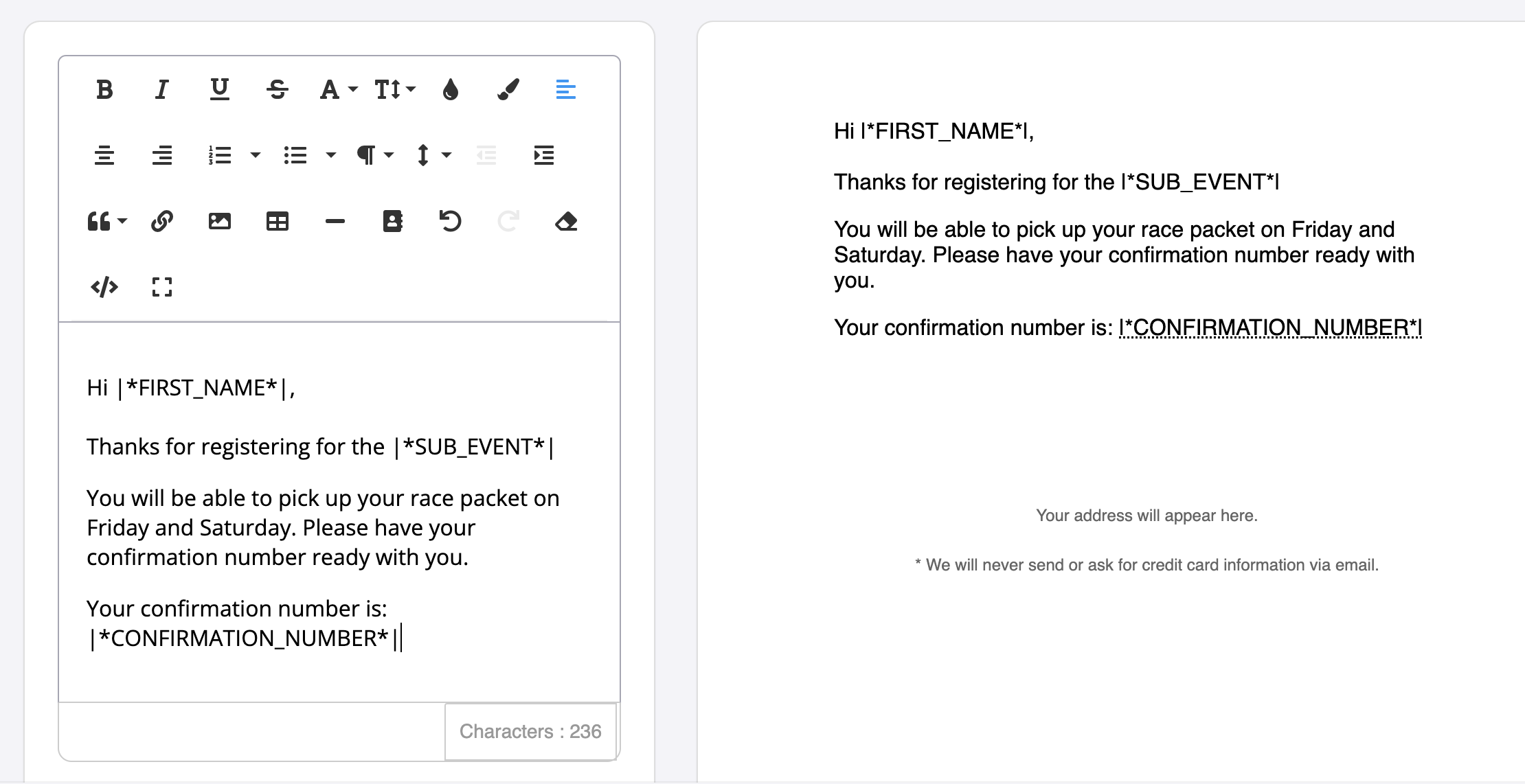 The information you collect in your registration form is saved and tied to a unique label, called a merge tag.