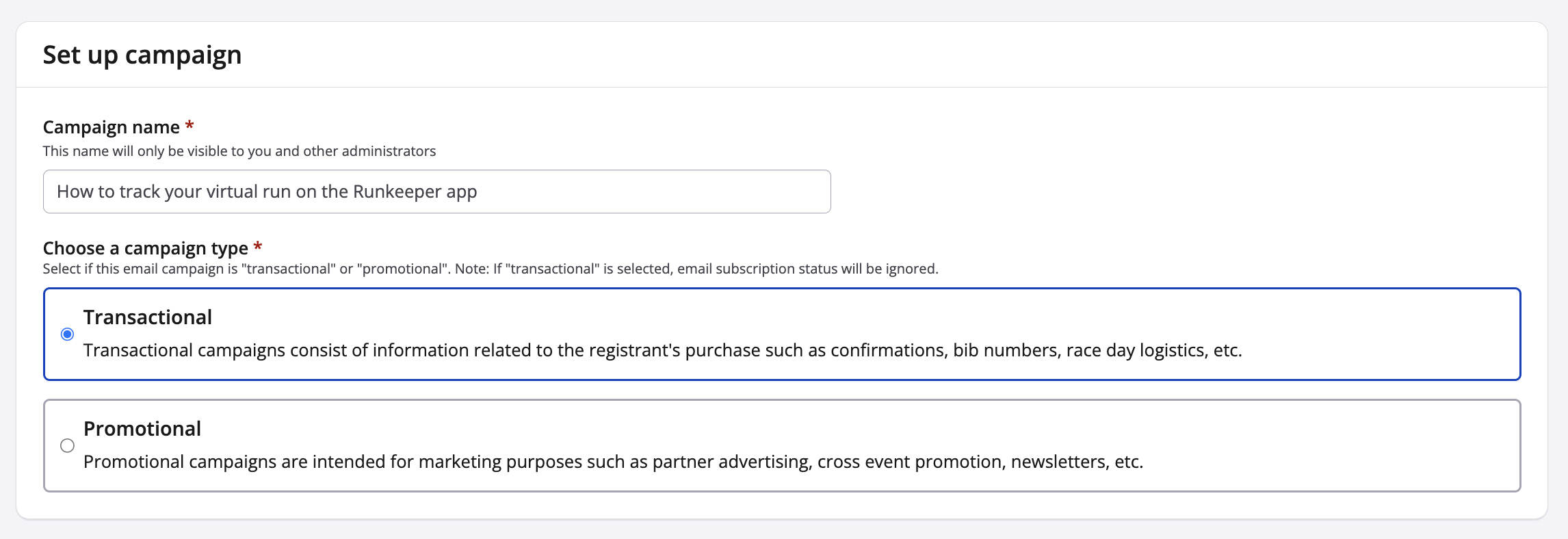 When creating an email campaign, the Set up step prompts event organizers to identify the campaign as Transactional or Promotional.
