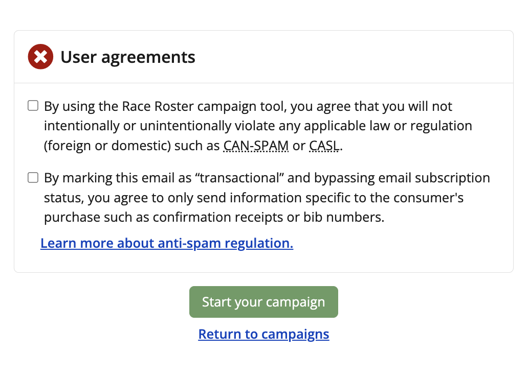 If an email campaign has been deemed Transactional, the Review step will prompt for an additional agreement. The event organizer may bypass the email subscription status only if the email campaign contains information directly relevant to the consumer's purchase, donation or transaction.